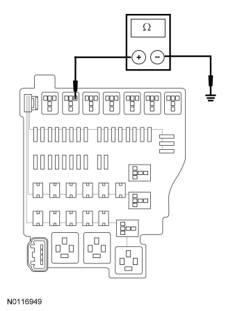 - Measure the resistance between BJB starter relay cavity 1, circuit CDC54 (WH/GN), harness side and ground.