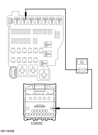 - Measure the resistance between BJB starter relay cavity 1, circuit CDC54 (WH/GN), harness side and RFA module C3503C-6.