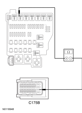 - Measure the resistance between BJB starter relay cavity 2, circuit CDC12 (YE), harness side and PCM C175B-24, circuit CDC12 (YE), harness side.