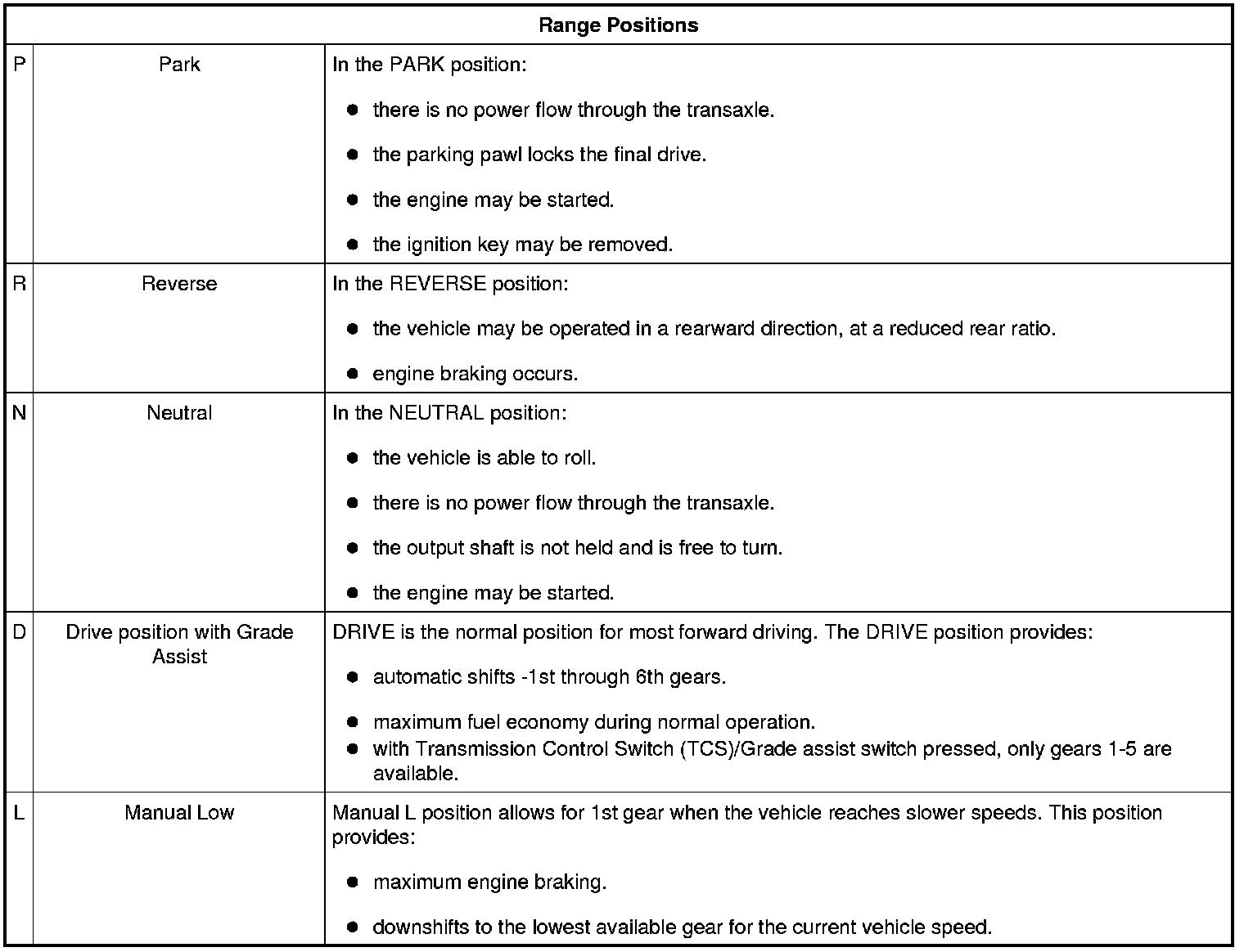 The transaxle range selector has 5 positions: P, R, N, D, L.
