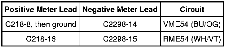 - For vehicles with the SYNC system, measure the voltage between the lower clockspring C218-5, circuit VME54 (BU/OG) and C218-16, circuit RME24 (BU/WH); and between the lower clockspring C218-8, circuit VME14 (GY/ YE) and C218-16, circuit RME24 (BU/WH).