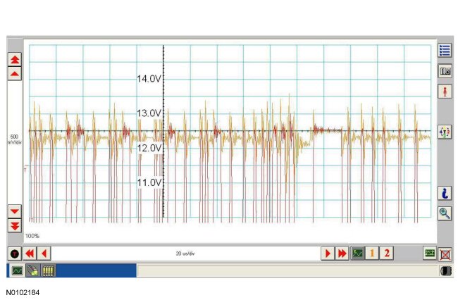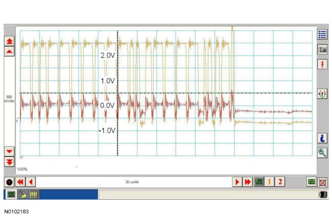 Traces below are viewed at 500mV per division (vertical axis) and 20 microseconds (20�s) per division (horizontal axis). Readings taken with a different oscilloscope vary from those shown. Compare any suspect readings to a known good vehicle.