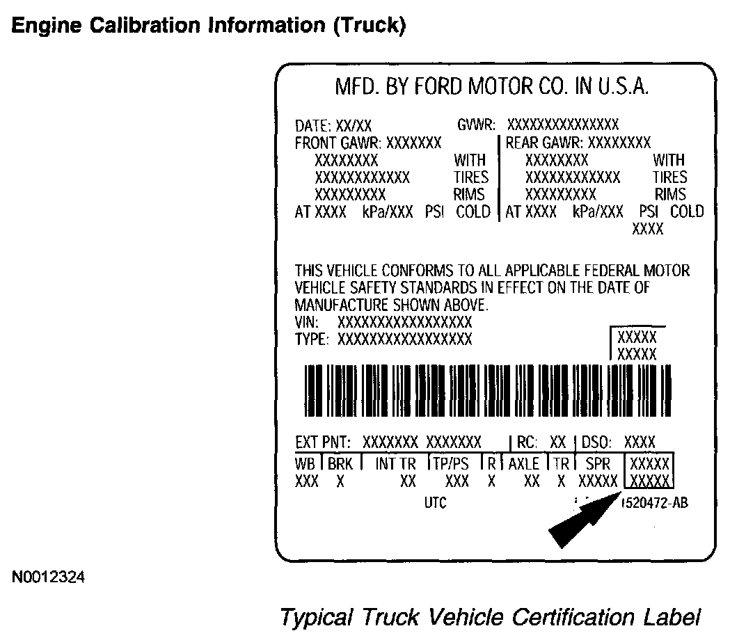 Base engine calibration information, sometimes referred to as the powertrain calibration, is located in the lower right corner of the vehicle certification label. Engine calibration information is limited to a maximum of 5 characters per line (2 lines maximum). Calibration information more than 5 characters long wraps to the second line of this field. Only the base calibration appears on this label. The revision level is no longer printed on the label. However, it can be found in the On-Line Automotive Service Information System (OASIS). For additional information on the vehicle certification label or engine calibration, refer to Vehicle Identification Codes.