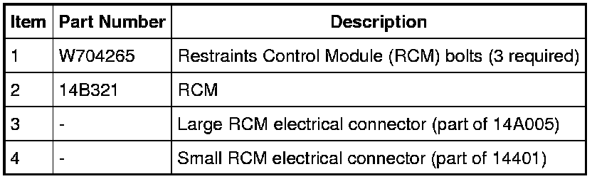 1. WARNING: Always tighten the fasteners of the restraints control module (RCM) and impact sensor (if equipped) to the specified torque. Failure to do so may result in incorrect restraint system operation, which increases the risk of personal injury or death in a crash.