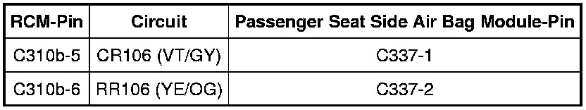 - Measure resistance between passenger seat side air bag C337-1, circuit CR106 (VT/GY), harness side and C337-2, circuit RR106 (YE/OG), harness side.
