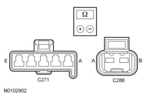 - Measure the resistance between blower motor C288-A, circuit VH219 (GY), harness side and blower motor C288-B, circuit VH301 (YE/BU), harness side.