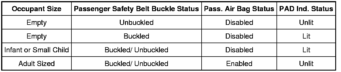 The following table indicates the passenger air bag status and the PAD indicator status based on the size of the front passenger occupant.