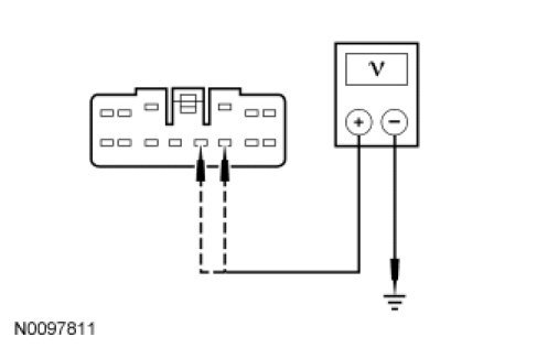 - Measure the voltage between wiper/washer module C2157-9, circuit SBB09 (RD), harness side and ground; and between wiper/washer module C2157-10, circuit CBP45 (YE), harness side and ground.