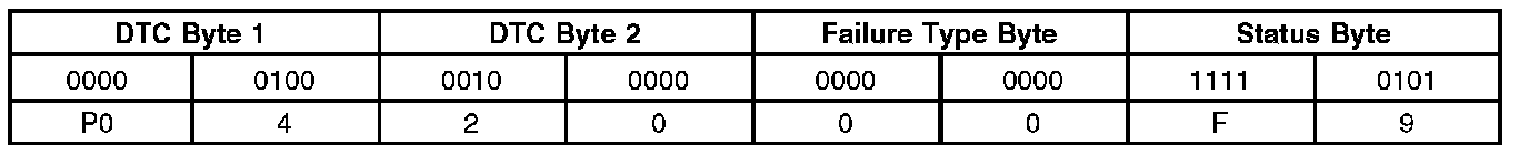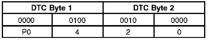Like all digital signals, DTCs are sent to the scan tool as a series of 1s and 0s. Each DTC is made up of two data bytes which each consist of eight bits that can be set to 1 or 0. The data is decoded by the scan tool to display each set of four bits as a hexadecimal number (0 to F) in order to display the DTCs in the conventional format. For example, P0420 Catalyst System Efficiency Below Threshold (Bank 1).