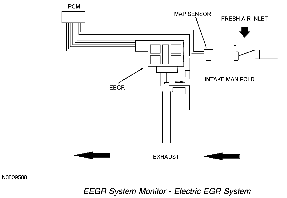 ELECTRIC EXHAUST GAS RECIRCULATION (EEGR) SYSTEM MONITORThe EEGR system monitor is an on-board strategy designed to test the integrity and flow characteristics of the exhaust gas recirculation (EGR) system. The monitor is activated during EGR system operation and after certain base engine conditions are satisfied. Input from the cylinder head temperature (CHT), intake air temperature (IAT), throttle position (TP), mass air flow (MAF), and manifold absolute pressure (MAP) sensors is required to activate the EGR system monitor. Once activated, the EGR system monitor carries out each of the tests described below during the engine modes and conditions indicated. Some of the EGR system monitor tests are also carried out during the on-demand self-test.