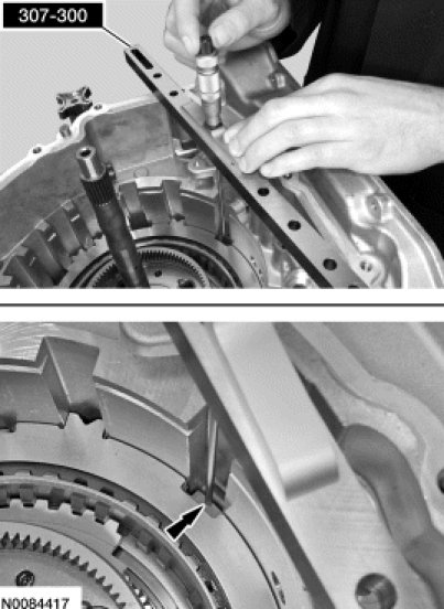 47. Install the Shim Selection Gauge 307-300 on the transaxle case.