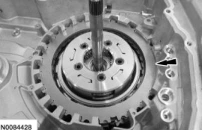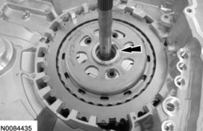 67. Apply 483 kPa (70 psi) of air pressure to the forward (1, 2, 3, 4) clutch piston port while recording the clutch pack clearance on the dial indicator. The clearance should be between 0.076 mm (0.002 in) and 1.840 mm (0.072 in). If the clearance is out of range, check the forward (1, 2, 3, 4) clutch pack for correct installation and the transaxle for correct assembly. If the forward (1, 2, 3, 4) clutch pack is correctly installed, install a new forward (1, 2, 3, 4) clutch pack.