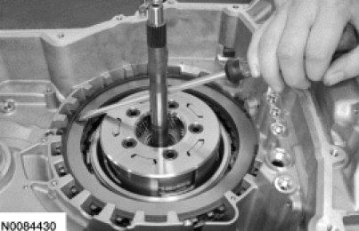 Install the forward (1, 2, 3, 4) clutch beveled snap ring with the flat side down with the gap facing the front of the transaxle.