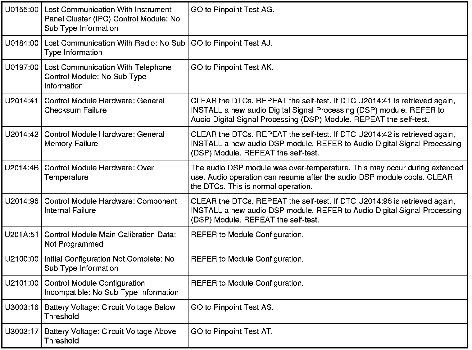 NOTE: This module utilizes a 5-character DTC followed by a 2-character failure-type code. The failure-type code provides information about specific fault conditions such as opens, or shorts to ground. Continuous memory DTCs have an additional 2-character DTC status code suffix to assist in determining DTC history.