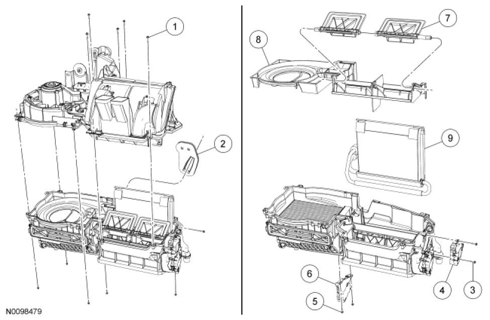 1. Remove the heater core and evaporator core housing. For additional information, refer to Heater Core And Evaporator Core Housing Service and Repair.