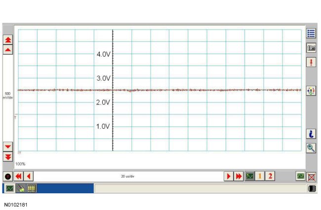 Traces below are viewed at 500mV per division (vertical axis) and 20 microseconds (20µ) per division (horizontal axis). Readings taken with a different oscilloscope vary from those shown. Compare any suspect readings to a known good vehicle.