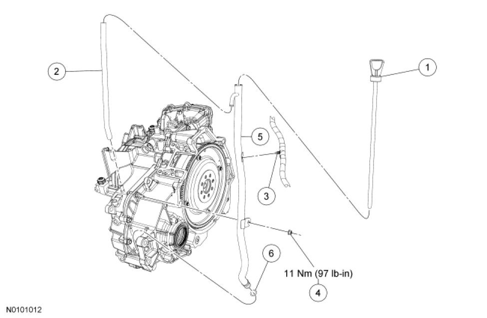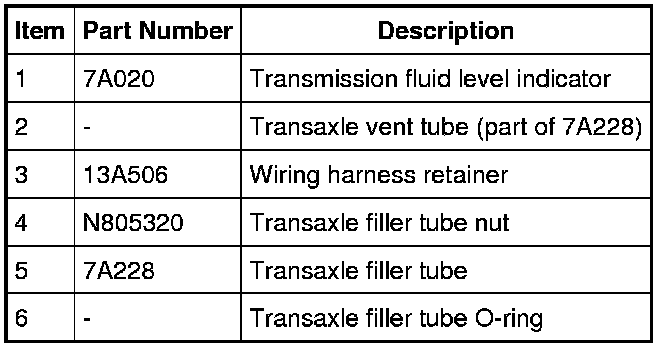 1. Inspect the O-ring seal on the transaxle filler tube for damage and install a new O-ring if needed. Lubricate the O-ring seal with clean automatic transmission fluid.