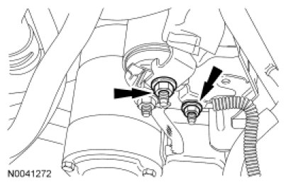 74. Disconnect the wiring harness fasteners from the transaxle-to-engine stud bolt and the starter.