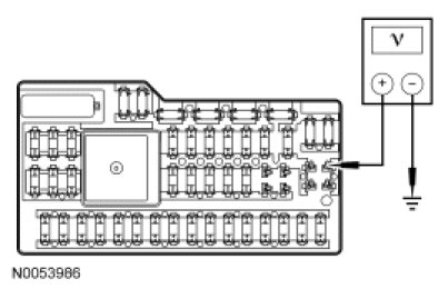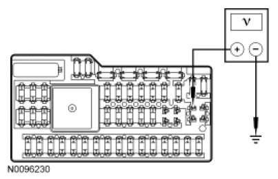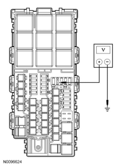- Measure the voltage between SJB fuse 28 (5A), circuit CE336 (GN/WH), input side and ground.