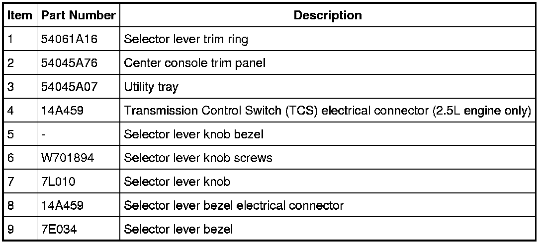 7. NOTICE: It is necessary to route the Transmission Control Switch (TCS) harness or select switch harness out of the selector lever bezel when removing the selector lever knob.