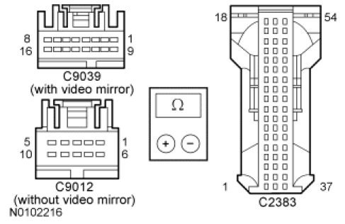 - For vehicles without video mirror, measure the resistance between the auto-dimming interior mirror C9012-10, circuit GD139 (BK/YE), harness side and ground.