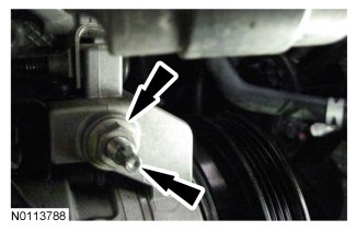25. Attach the wiring harness retainer to the A/C compressor stud bolt.
