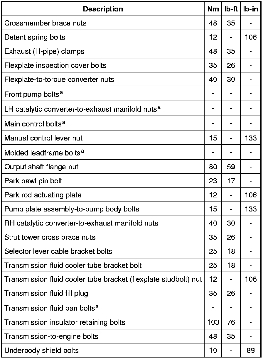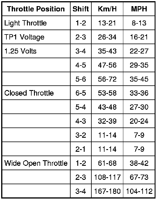 NOTE: Shift speed ranges are approximate for all applications. For specific applications (engine, axle ratio, tire size and application), refer to the Automatic Transmission Specification booklet.