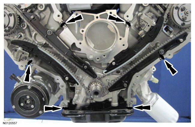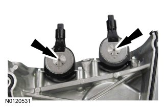 1. NOTICE: The Variable Camshaft Timing (VCT) variable force solenoid pins must be fully depressed to avoid interference with the VCT valve tips when installing the engine front cover. Failure to follow these instructions can result in damage to the engine.
