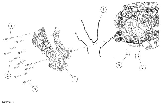 - Install the 13 engine front cover bolts, 2 stud bolts and the 4 oil pan-to-engine front cover bolts finger-tight.