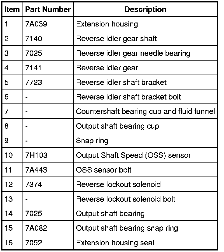 11. Remove and discard the snap ring. Position the extension housing with the seal facing downward. Using a brass drift, remove the output shaft bearing.