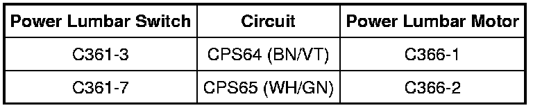 - Measure the voltage between power lumbar motor C366-1, circuit CPS64 (BN/VT), harness side and power lumbar motor C366-2, circuit CPS65 (WH/GN), harness side.