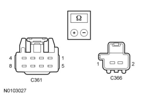 - Measure the resistance between power lumbar switch C361, harness side and power lumbar motor C366, harness side, using the following chart: