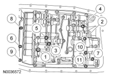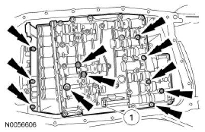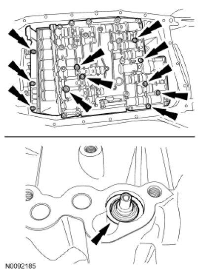 9. NOTICE: During removal of the main control assembly, the thermal bypass valve may fall out of the transmission case. Damage to the valve may occur if the valve falls out.