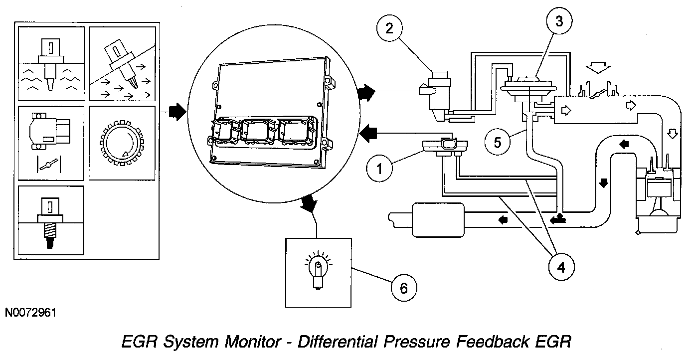 3. The test for a stuck open EGR valve or EGR flow at idle is continuously carried out at idle sensor indicating closed throttle). The monitor compares the differential pressure feedback EGR circuit voltage at idle to the differential pressure feedback EGR circuit voltage stored during key ON engine OFF (KOEO) to determine if EGR flow is present at idle.