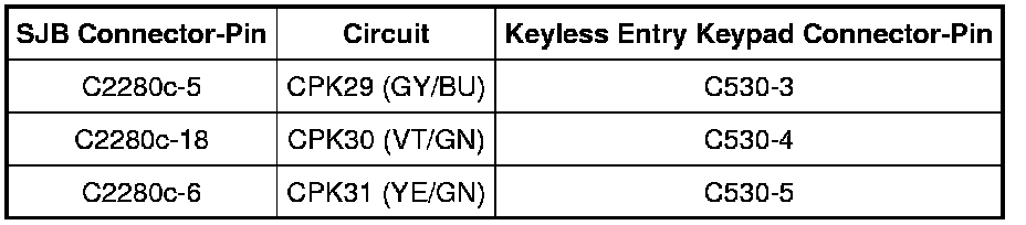 - Connect a fused jumper wire between the keyless entry keypad, harness side, while monitoring the SJB PID (KEY_PAD) as follows: