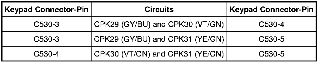 - Measure the voltage between the keyless entry keypad C530-1, circuit SBP13 (GY/RD), harness side and ground.