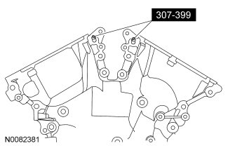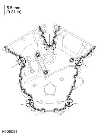 - Apply a 5.5 mm (0.21 in) bead of Motorcraft(R) High Performance Engine RTV Silicone to the oil pan-to-cylinder block joint and the cylinder head-to-cylinder block joint areas of the engine front cover in 5 places as indicated.