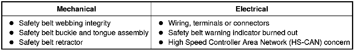 3. If the inspection reveals an obvious concern(s) that can be readily identified, service as required. With the exception of removing a twist from the safety belt webbing, do not attempt to repair a component of the safety belt system; new components must be installed.