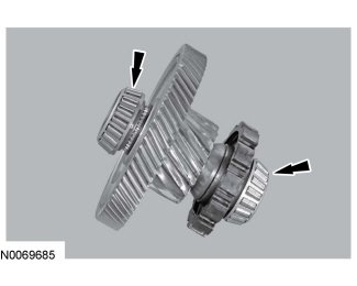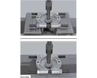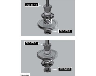 2. Using the Differential Bearing Installer and Guide 307-587 (307-587/2 and 307-587/3) and a press, install new transfer shaft bearings on the transfer shaft assembly.