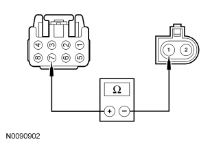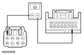 - Measure the resistance between RH front window control switch C604-4, circuit CPW12 (GN/OG), harness side and LH front window control switch C504-10, circuit CPW12 (GN/OG), harness side.