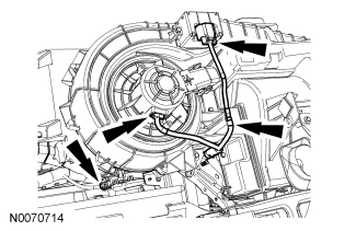 10. Disconnect the 3 electrical connectors, detach the wire harness pin-type retainer and detach the instrument panel harness from the heater core and evaporator core housing,