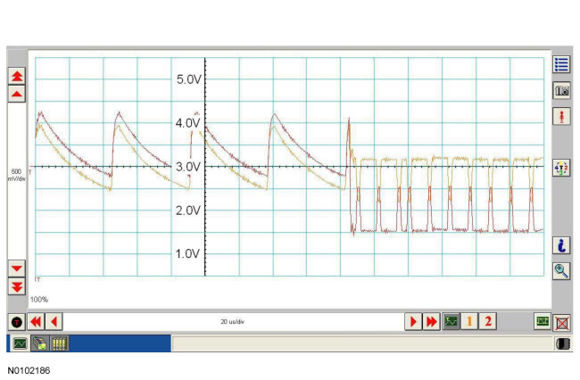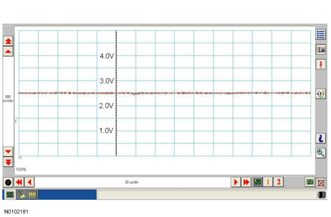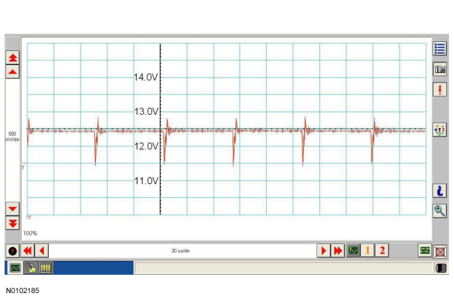 Traces below are viewed at 500mV per division (vertical axis) and 20 microseconds (20�s) per division (horizontal axis). Readings taken with a different oscilloscope vary from those shown. Compare any suspect readings to a known good vehicle.