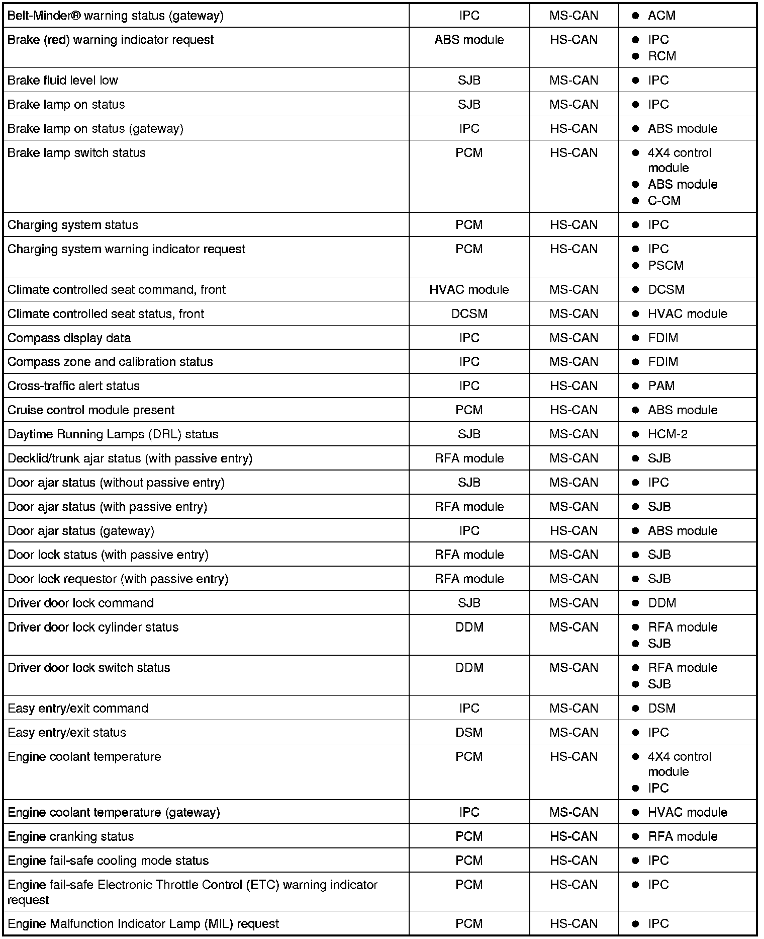 NOTE: This chart describes the specific HS-CAN and MS-CAN messages broadcast by each module, and the module(s) that receive the message.