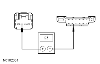 - Measure the resistance between the FCIM C2402-2, circuit VDB06 (GY/OG), harness side and the DLC C251-3, circuit VDB06 (GY/OG), harness side.
