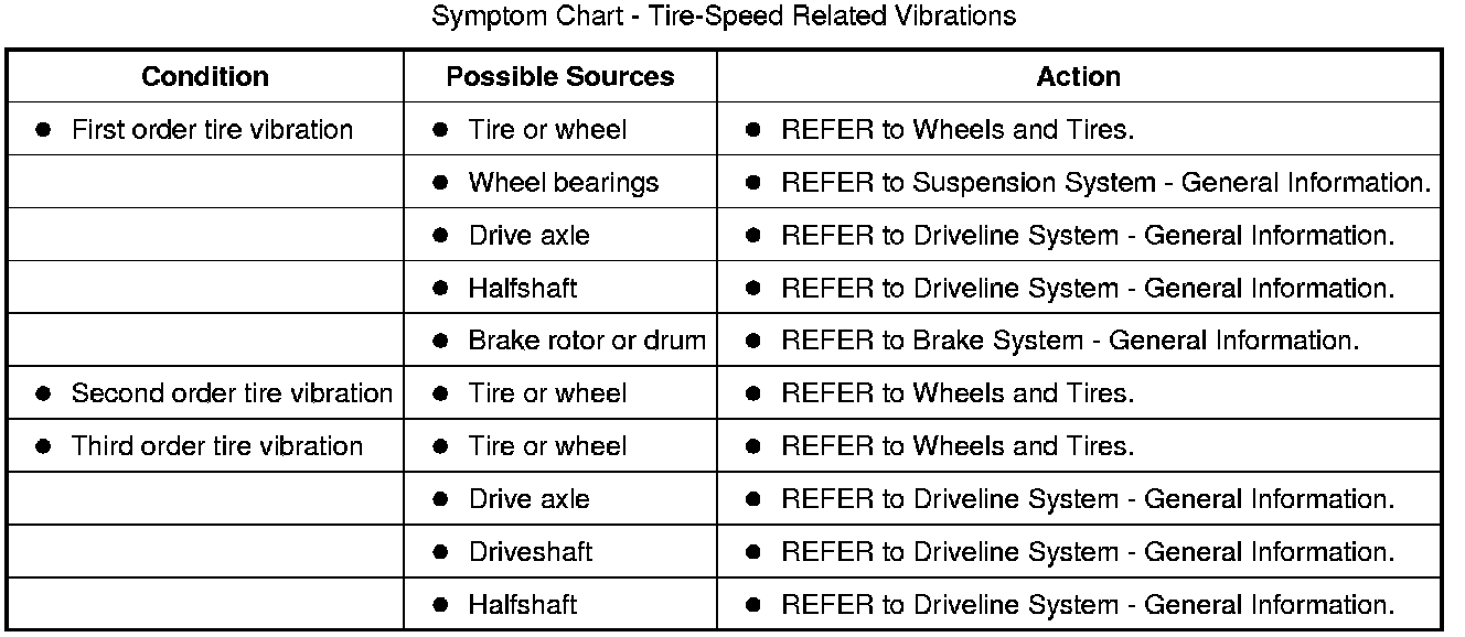 Use the diagnostic instructions along with the necessary listed tools to identify the vibration order and to isolate the symptom and the possible systems associated with that symptom. Then based on the results from the road test, make a determination of which action in the symptom chart to take first. Since it is possible any one of multiple systems may be the cause of the symptom, it may be necessary to use a process of elimination type diagnostic approach to pinpoint the concern. Refer to the indicated information to identify and isolate the cause or rule that system out as being the causal system for the symptom.