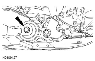 9. Position the roll restrictor in place and install the engine roll restrictor-to-subframe through bolt.