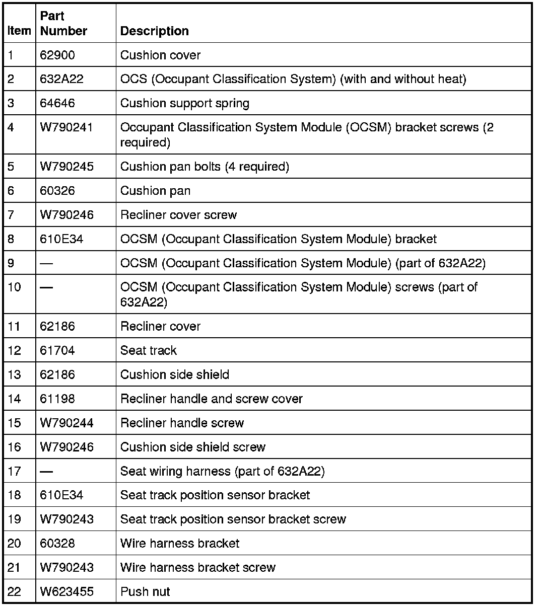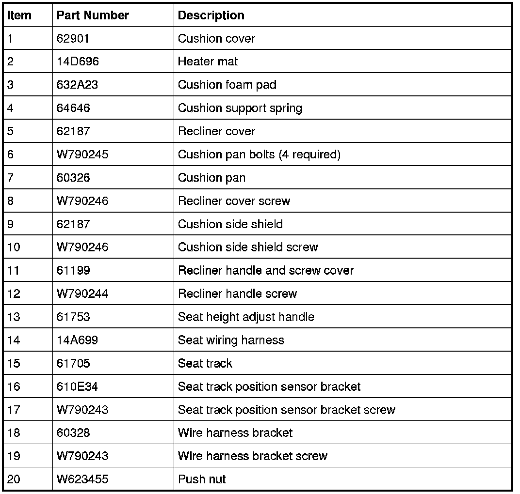 NOTE: For passenger seat cushion Occupant Classification System (OCS) system components, refer to Restraints and Safety Systems &/or Air Bag Systems.