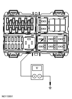 - Measure the voltage between driver heated seat relay socket pin 2, circuit CHS02 (YE/BU), harness side and ground.