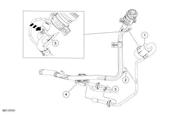 NOTE: Press the release tab to disengage the fresh air hose from the fuel filler pipe bracket.
