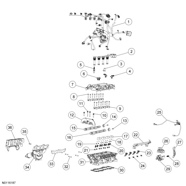 - Stage 1: Tighten the bolts evenly, half a turn at a time, until the camshaft bearing caps and the VCT (Variable Camshaft Timing) bridge are seated against the cylinder head.